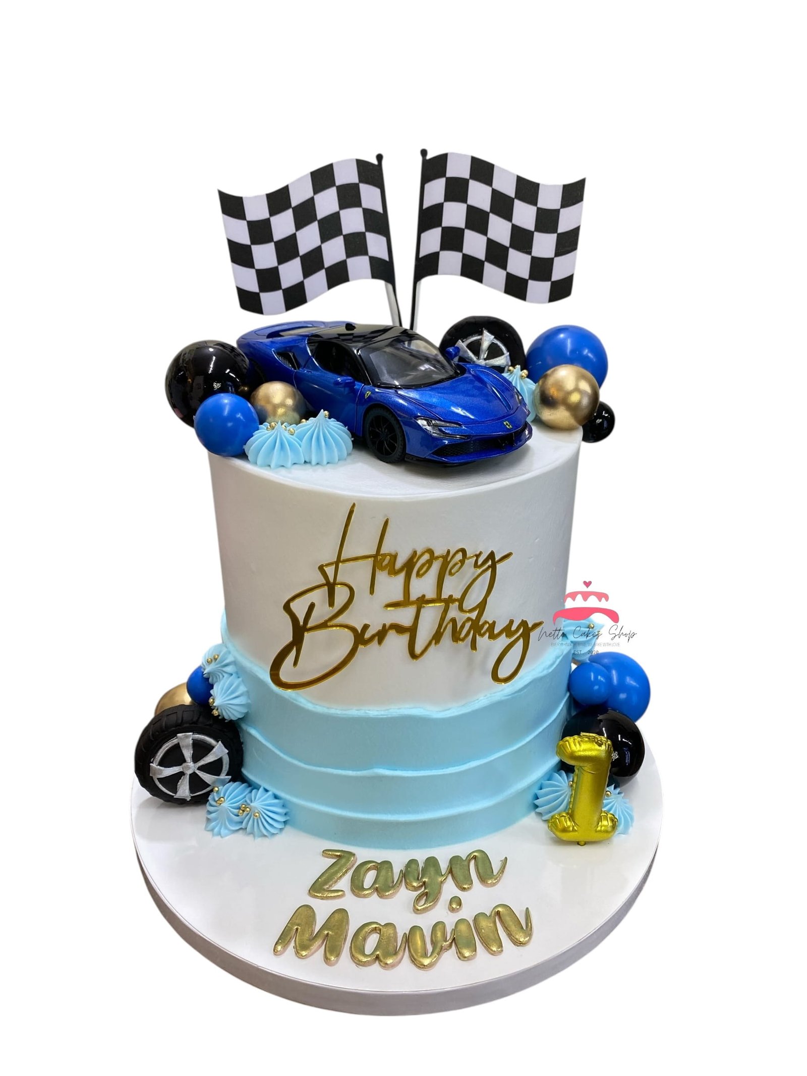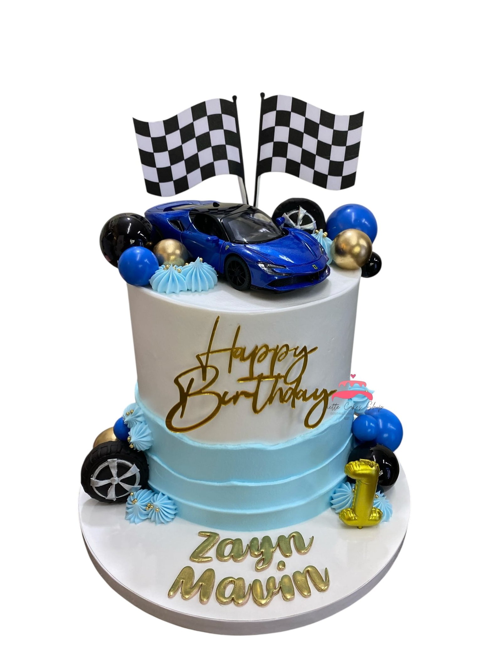 This customized racing car themed cake is perfect for all ages — a treat for car enthusiasts or a show-stopping centerpiece for your child’s birthday!
